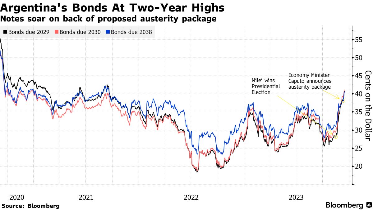 庆祝活动举行得非常多。阿根廷的债券上涨至两年来的最高水平,IMF表示欢迎,美国财政部高层飞抵,高盛变得看涨,主权风险下降。乌克兰领导人沃洛迪米尔·泽连斯基前往华盛顿之前曾辛苦跋涉,赞扬了米莱伊的就职典礼。