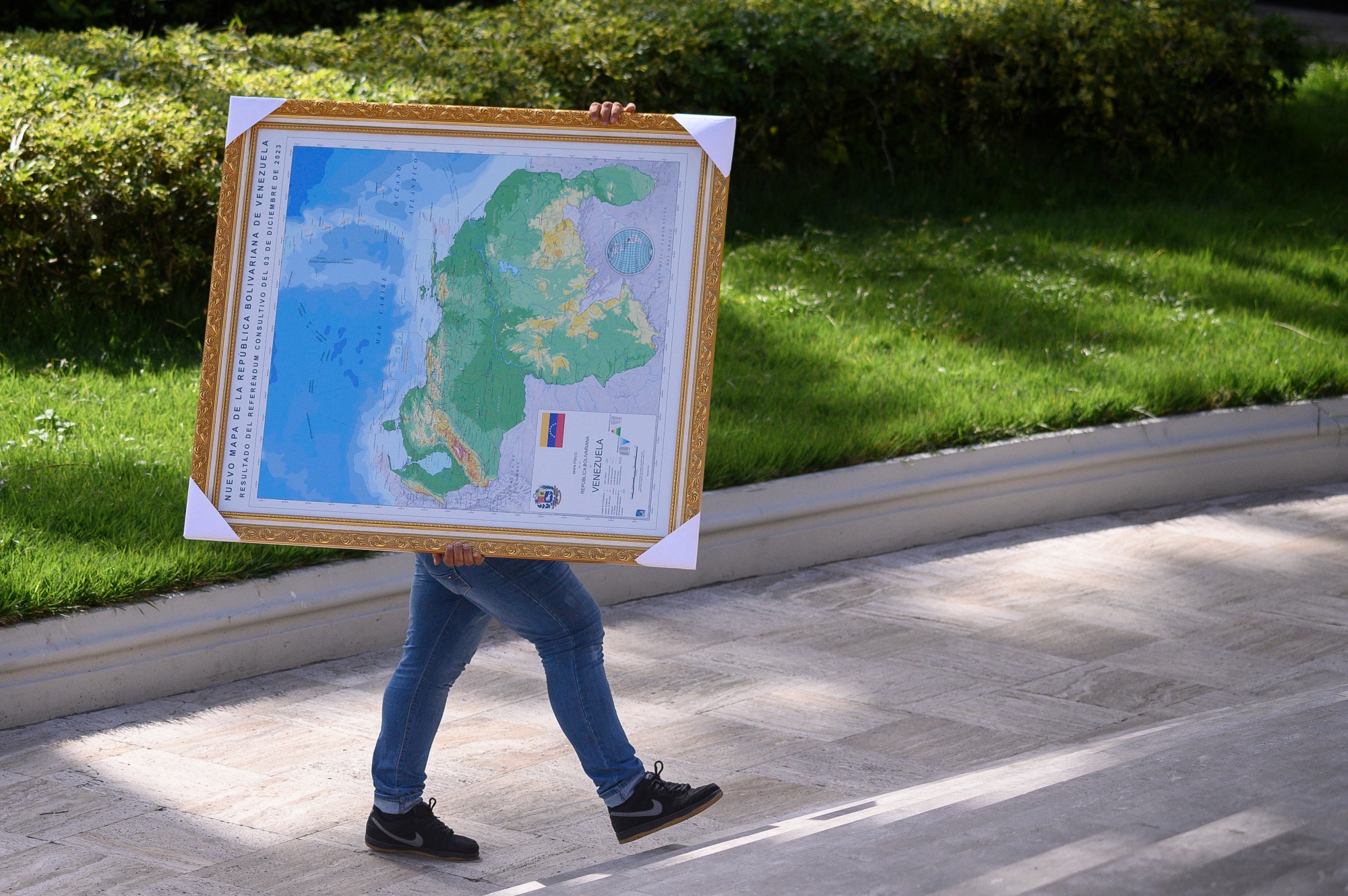 一名国民议会工作人员在加拉加斯携带一张标有委内瑞拉领土埃塞基博的地图。摄影师:Gaby Oraa/Bloomberg委内瑞拉和圭亚那同意在首次会晤中不对彼此使用武力,以减少有关有争议的埃塞基博领土的紧张局势。
