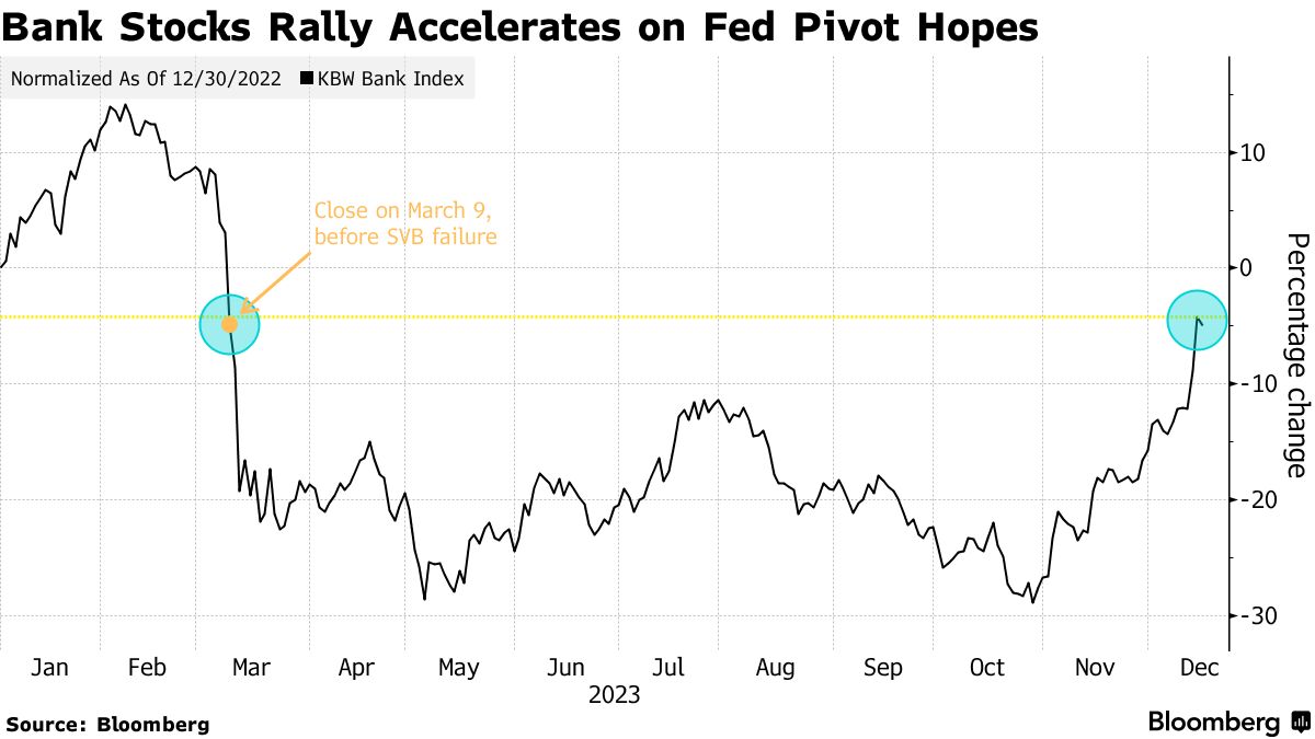 周三下午会议后,KBW银行指数在两天内飙升了9%,创下了近三年来最佳的涨幅。这帮助将该指数推高至3月8日之前的最高水平,就在硅谷银行倒闭之前。利率下调的前景减轻了人们对银行证券投资组合未实现损失、存款竞争以及整体经济健康状况的担忧。