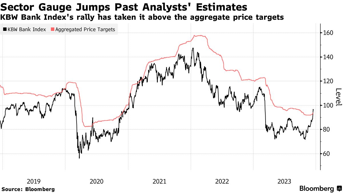 分析师对股票走势看法不一。根据彭博编制的数据,KBW银行指数中的两打股票的合并12个月价格目标现在暗示着稍微负面的回报潜力。
