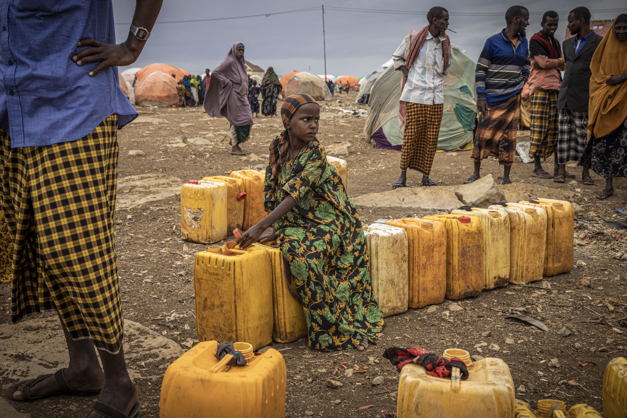 一个女孩坐在2022年9月索马里巴伊多阿的干旱灾民营的水瓶上。