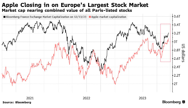 苹果的涨势,世界上市值最高的上市公司,显示出了没有放缓的迹象。在周三创下历史新高之后,这家iPhone制造商的市值接近欧洲最大的股票市场——法国。根据彭博编制的指数,巴黎上市公司的综合市值截至周三收盘约为3.2万亿美元,而这家科技巨头的市值为3.1万亿美元。苹果比世界上除了六个最大的股票市场之外的所有股票市场都要大。