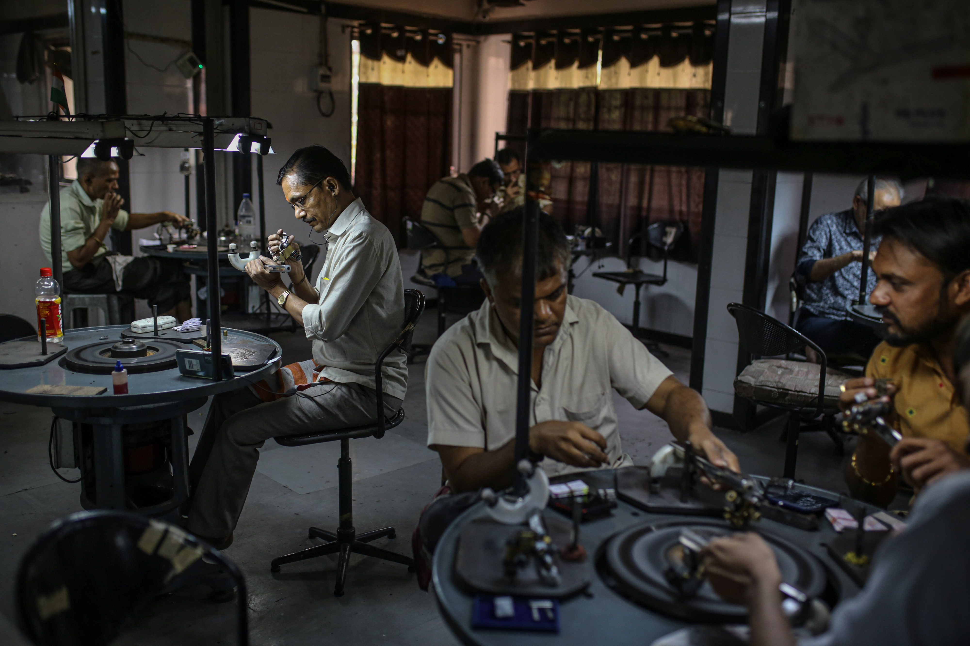 如今,在苏拉特最大的市场Mahidharpura,建筑物内摆满了一排排的桌子,上面摆放着明亮的灯光下交易宝贵的宝石,有些交易者甚至在街道上检查放在棉布上的钻石。交易者经常在城市里走动,把宝石紧紧包裹在白纸或缝在衬衫内侧的小袋子里。