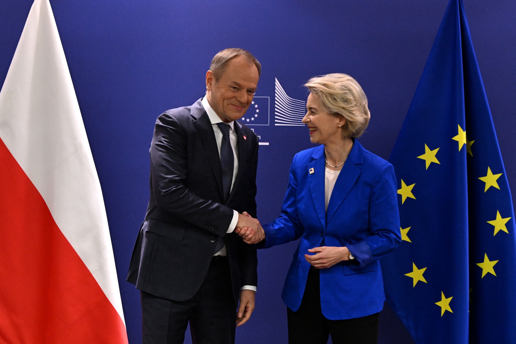 唐纳德·图斯克(左)和乌苏拉·冯·德·莱恩于12月15日在布鲁塞尔。摄影师:约翰·泰斯/法新社图斯克要求拨款,欧盟委员会主席乌苏拉·冯·德·莱恩表示态度积极——只要波兰实施一系列改革。
