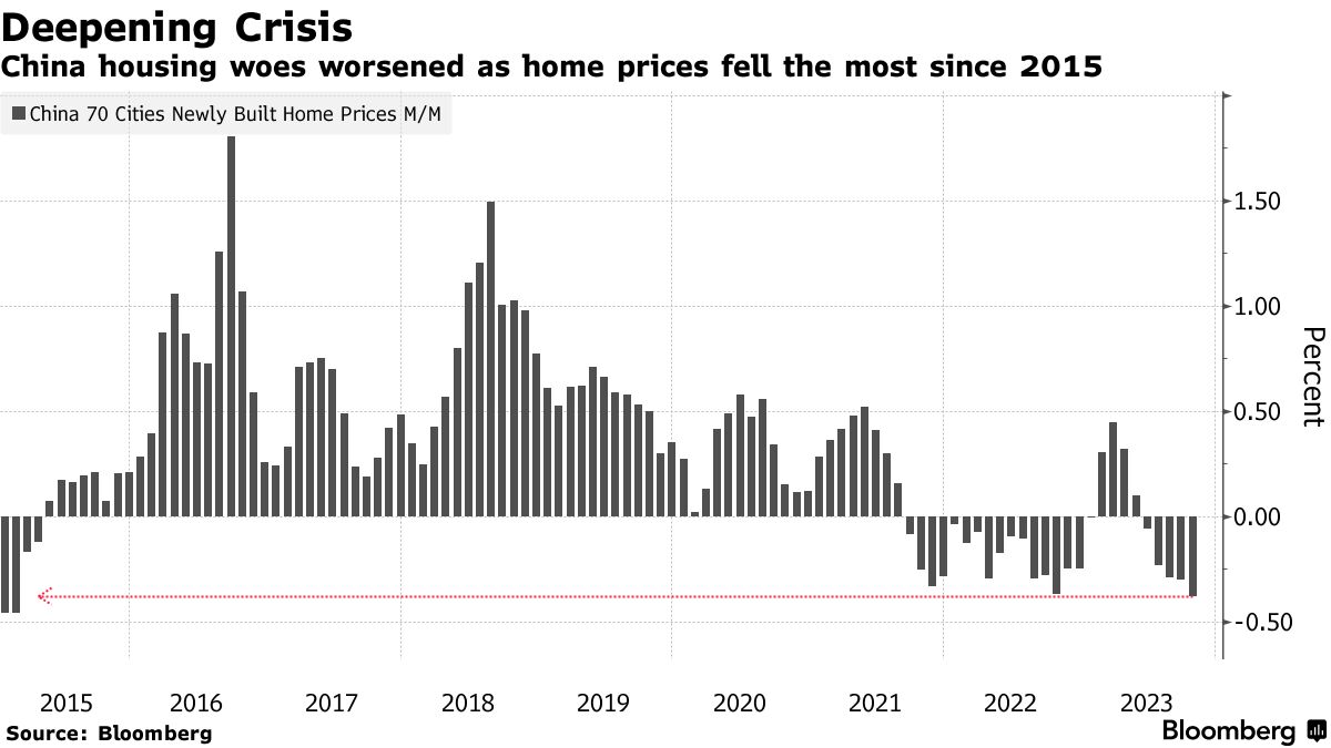 家庭财富下降的核心是中国的房地产崩盘,这对一个70%的家庭资产都与房地产挂钩的社会产生了普遍影响。据彭博经济学称,房价每下跌5%,将会消灭19万亿人民币(2.7万亿美元)的住房财富。