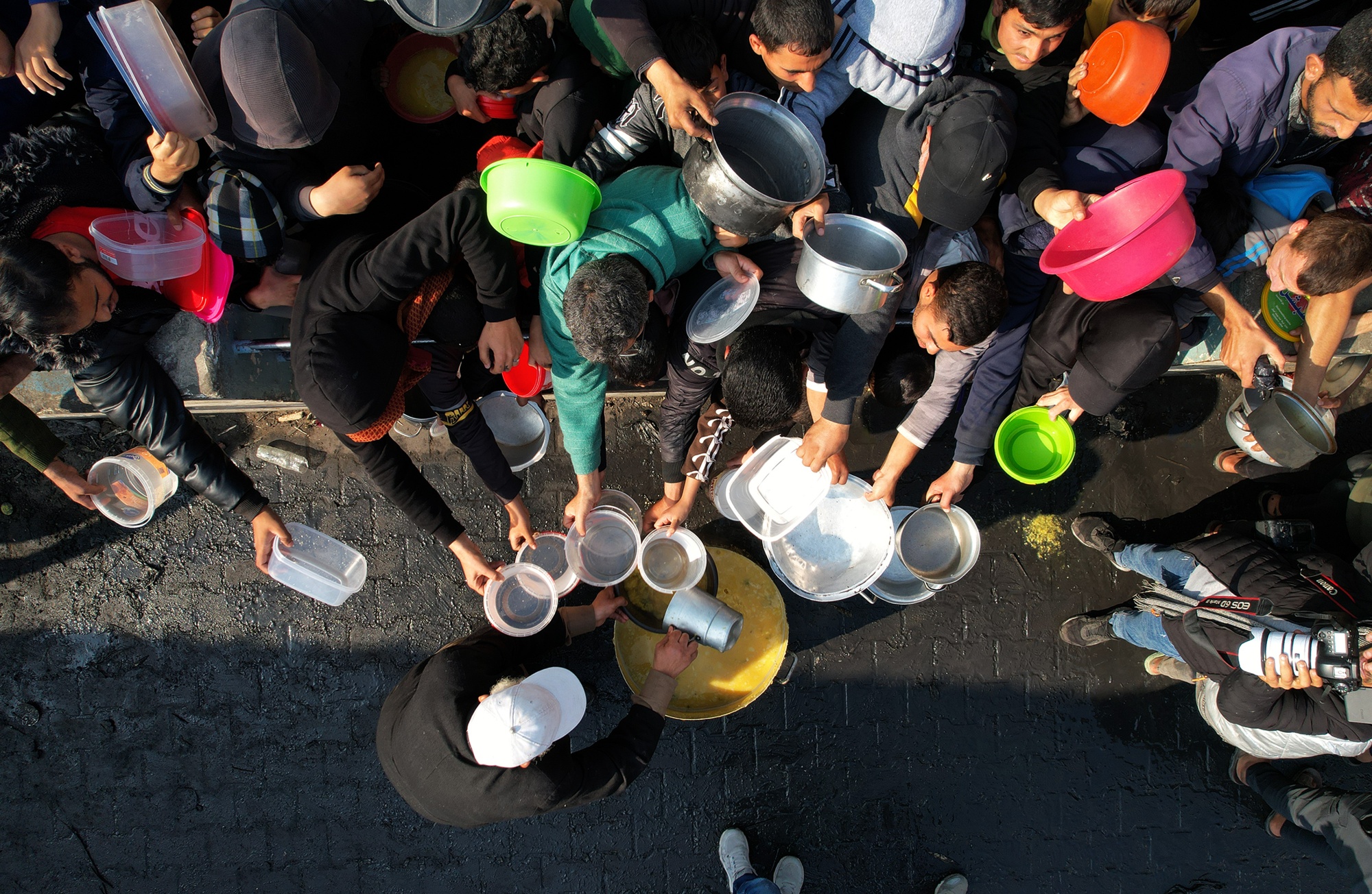 巴勒斯坦人在加沙拉法赫的一家志愿医院领取免费食品,时间是12月18日。