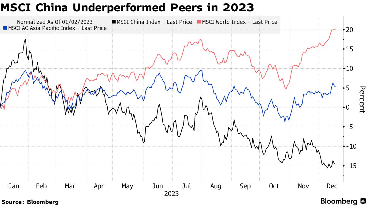 Raymond Ma来源:英威资本有限公司这一乐观的预测出现在华尔街银行在另一年表现糟糕的情况下已经调低了他们对2024年中国股市的预期,MSCI中国指数在另一年表现糟糕的情况下已经调低了他们对2024年中国股市的预期,该指数下跌超过14%,落后于全球同行。尽管该指数交易估值低于其五年平均水平,但中国持续存在的房地产危机、疲弱的家庭需求和通货紧缩风险继续拖累股市。