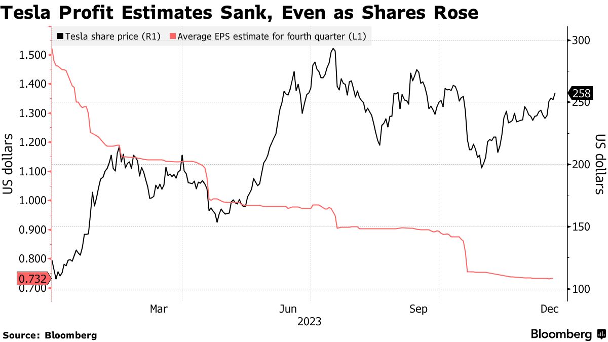 特斯拉(TSLA)分析师对2024年变得更加谨慎,因为电动车增长放缓正在逼近-彭博社