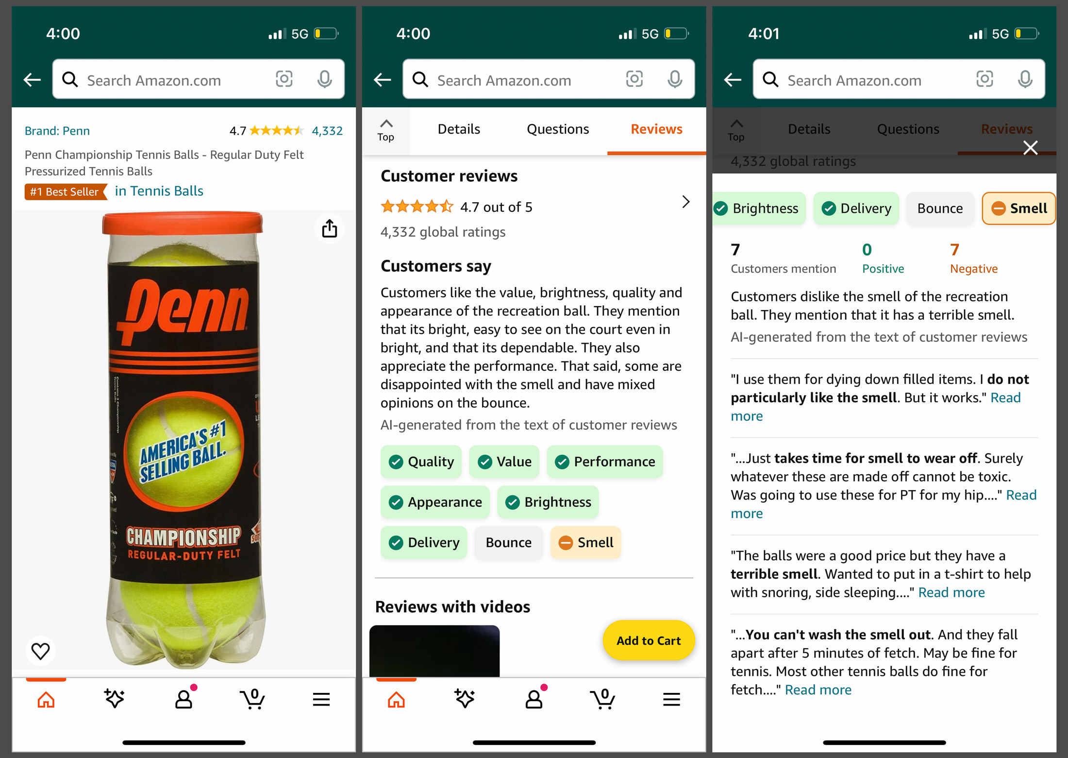 对宾网网球的总结称一些评论者对产品的气味感到失望。售价4美元的3个网球装以来自4300多名评论者的评价为基础,拥有4.7星的评分,但只有七条评论提到了气味。亚马逊将总结分解成了几个按钮,包括“质量”、“价值”和“气味”。购物者需要点击“气味”按钮才能发现有多少评论者抱怨了气味。