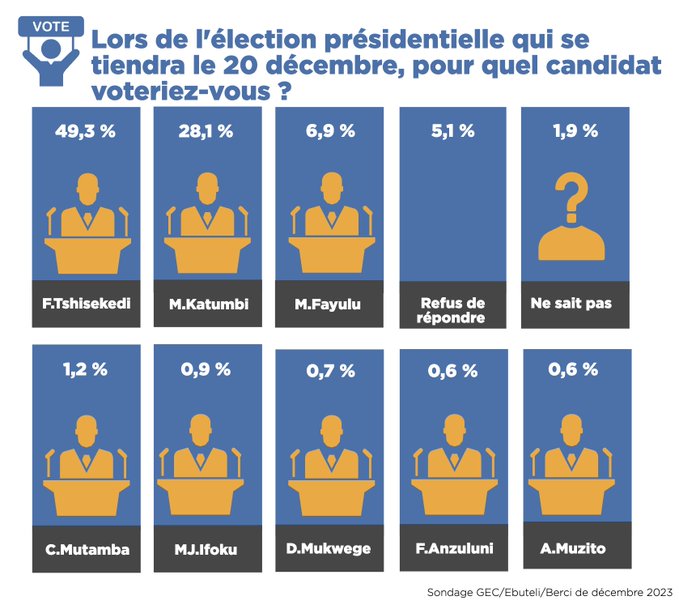 根据刚果的Le Bureau d’Etudes, de Recherche et de Consulting International发布的调查显示,齐塞克迪将获得49.3%的选票,而他最接近的竞争对手可能是商人莫伊塞·卡通比(Moise Katumbi),预计得票率为28.1%。这项民意调查是与刚果非政府组织Ebuteli和纽约大学刚果研究小组合作进行的。