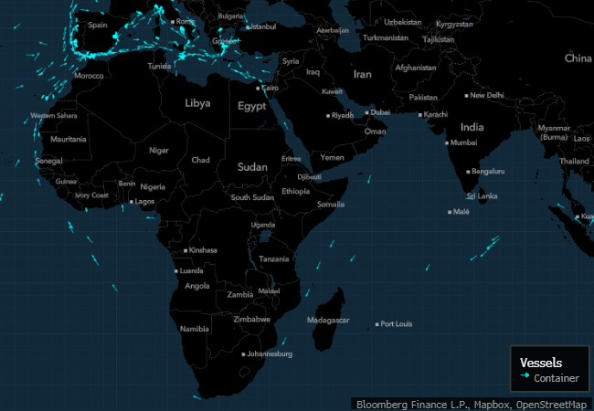 根据彭博社编制的船舶跟踪数据显示,目前只有一艘集装箱船在红海上,其余的船只正在离开亚洲,前往非洲周围。