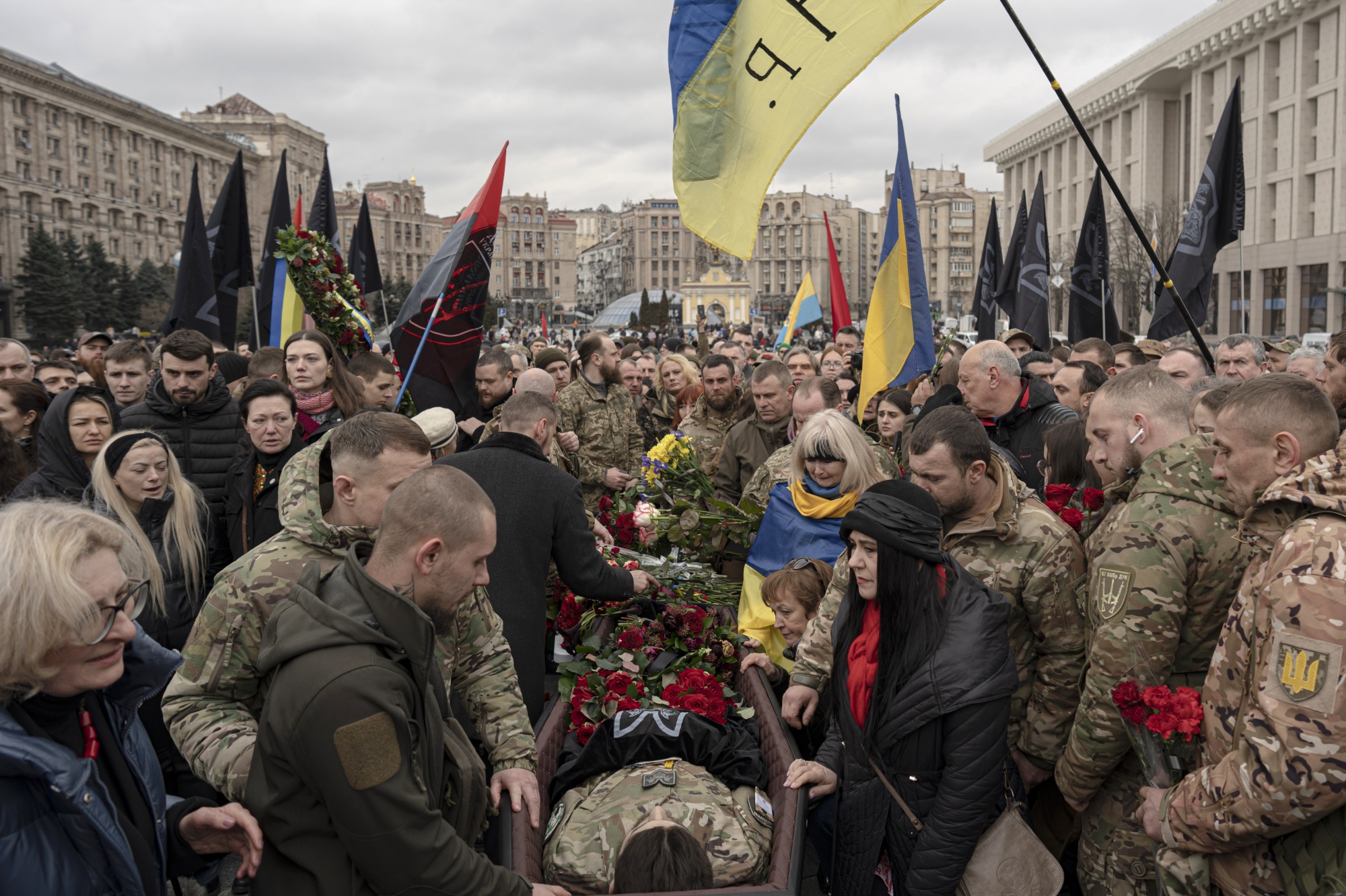 悼念者参加了乌克兰军事指挥官德米特罗·科齐巴洛(Dmytro Kotsiubaylo)的葬礼,地点在乌克兰基辅的圣弥额尔大教堂,时间是三月。在俄罗斯试图控制邻国的过程中,成千上万的人丧生,而战斗已经迫使乌克兰4100万人口中的超过三分之一无家可归。