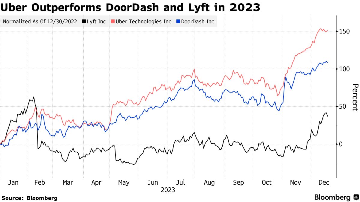 优步科技公司 今年股价上涨超过150%,公司连续几个季度实现盈利并且需求增加,帮助该股票表现优于竞争对手。其中包括规模较小的在线食品配送公司DoorDash Inc.,今年市值翻了一番,以及叫车公司Lyft Inc.,股价上涨了37%。这三只股票周三都有所下跌。