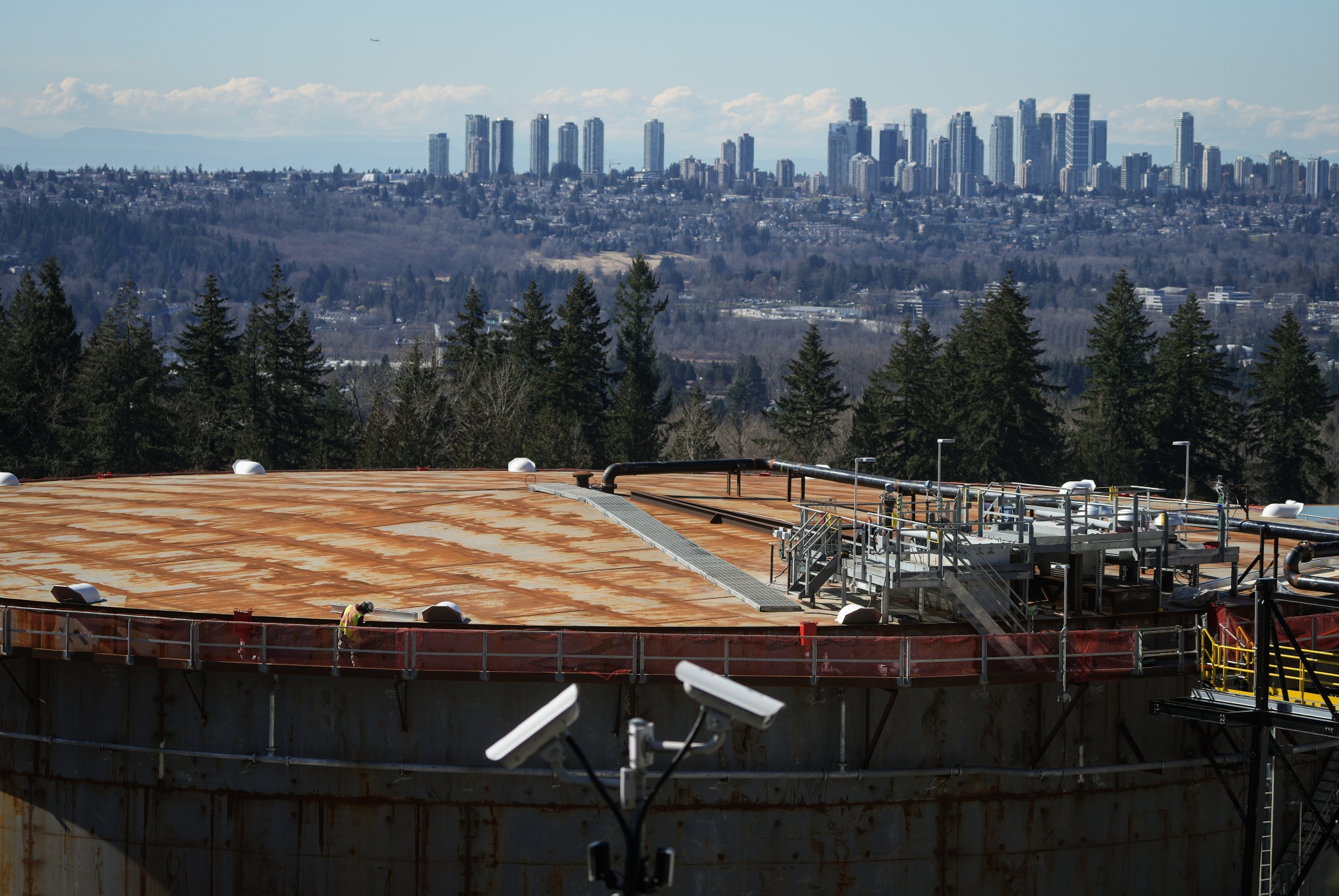在加拿大不列颠哥伦比亚省本拿比的本拿比终端储罐农场进行的跨山管道扩建项目施工,时间为2023年3月27日星期一。