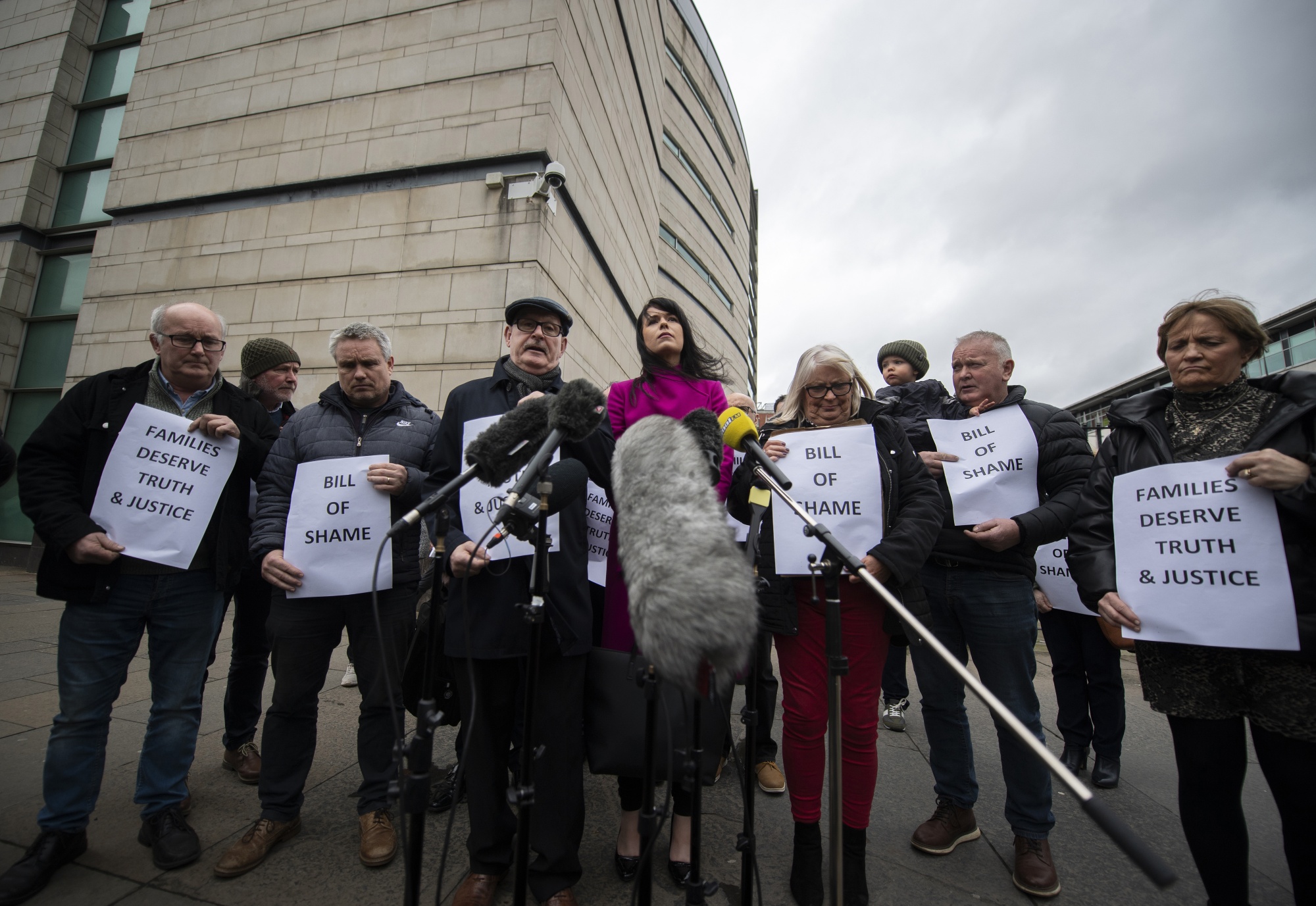 北爱尔兰麻烦的受害者的亲属在2月2日在北爱尔兰贝尔法斯特的拉根赛德法院外向媒体发表讲话。