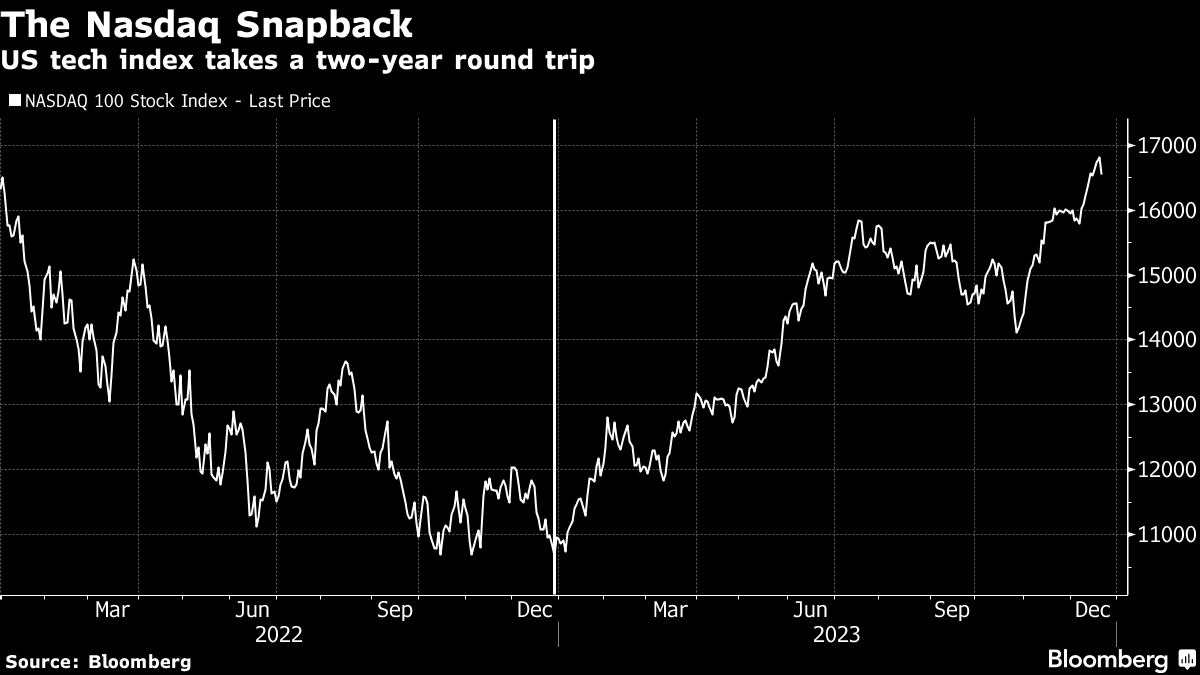 这里有另一个有趣的“完整循环”图表。Brent Donnelly在他出色的am/FX通讯中指出了这一点。美国科技股(以纳斯达克100指数衡量)在2021年年底达到顶峰。然后在2022年,随着利率上涨触发了熊市,它们开始下滑。但在2023年的大部分时间里,它们一直在上涨(由“七巨头”带领。)