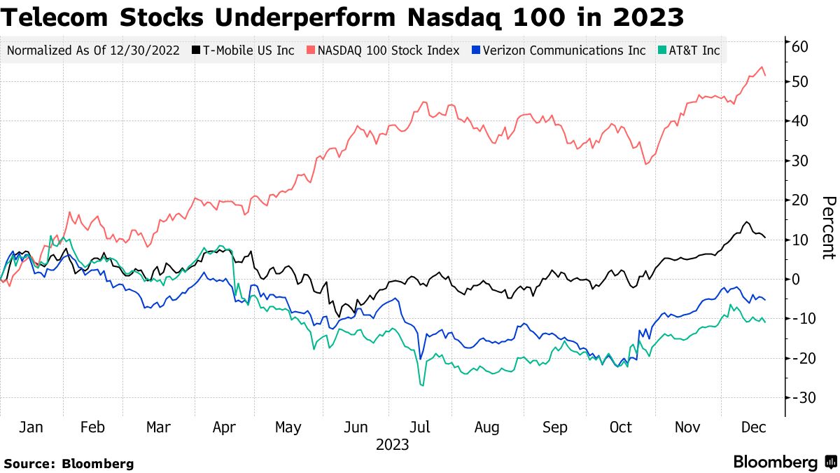 虽然纳斯达克100指数今年已飙升超过50%,但一些股票完全错过了这波涨势。美国T-Mobile公司2023年上涨约11%,但同行的威瑞森通信公司和AT&T公司都下跌。AT&T是该集团中表现最差的股票,因为担忧可能需要清理其全国网络中的含铅电线而面临的高成本。周四,这些股票上涨,而纳斯达克100指数也上涨了1%。