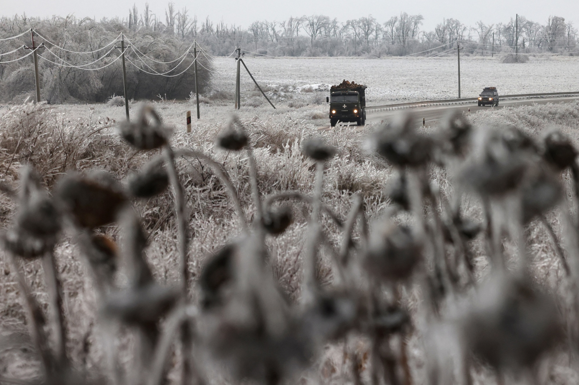乌克兰军车驶过顿涅茨克地区一片冰封的向日葵田,12月12日。