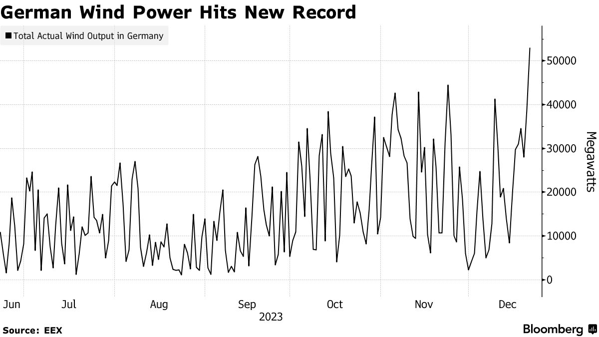 风力发电在德国和英国均达到了创纪录的高峰,因为一股覆盖北欧的风暴推动了整个地区的发电量。