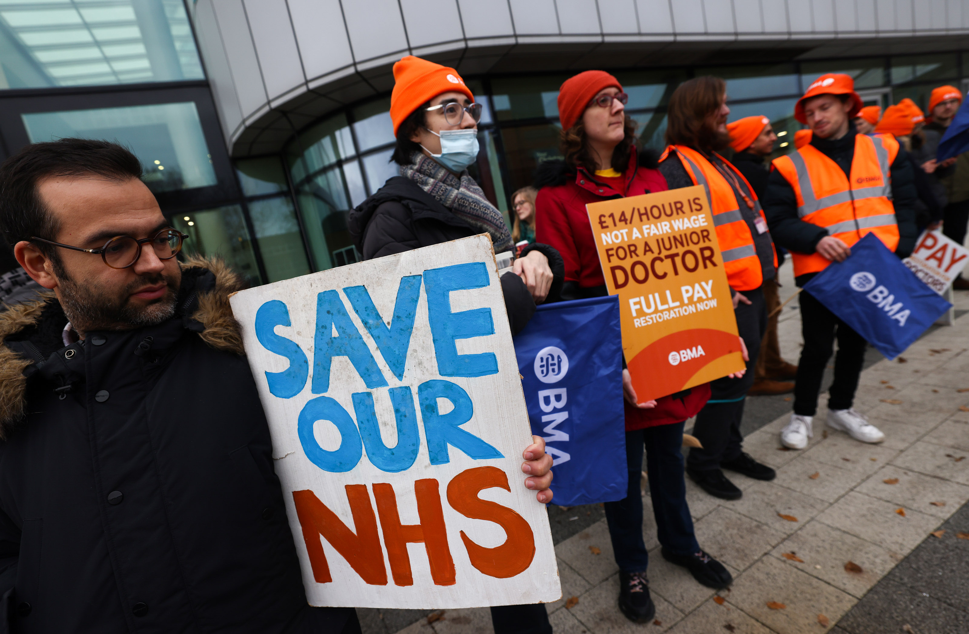 英国伯明翰伊丽莎白女王医院外的初级医生在罢工纠察线上,12月20日。