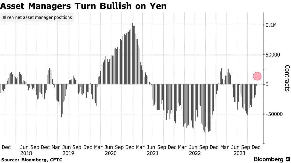 资产管理人员首次自5月以来从看跌转为看涨日元,因为越来越多的人认为日本央行可能会在2024年结束其超宽松的政策,而其主要同行则会降息。