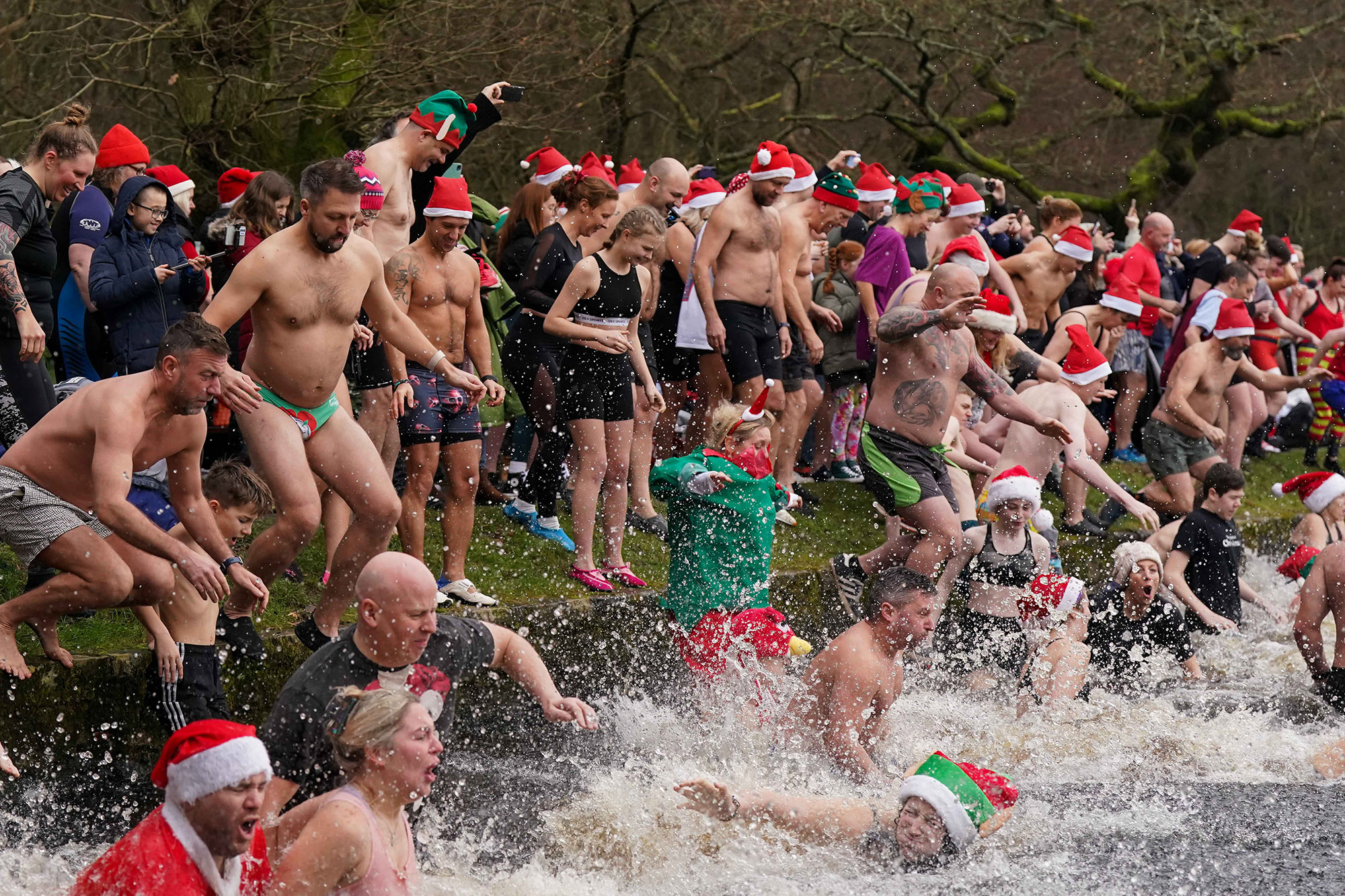 游泳者在英国伯明翰萨顿公园的布莱克鲁特池中圣诞节下水。日期为12月25日。
