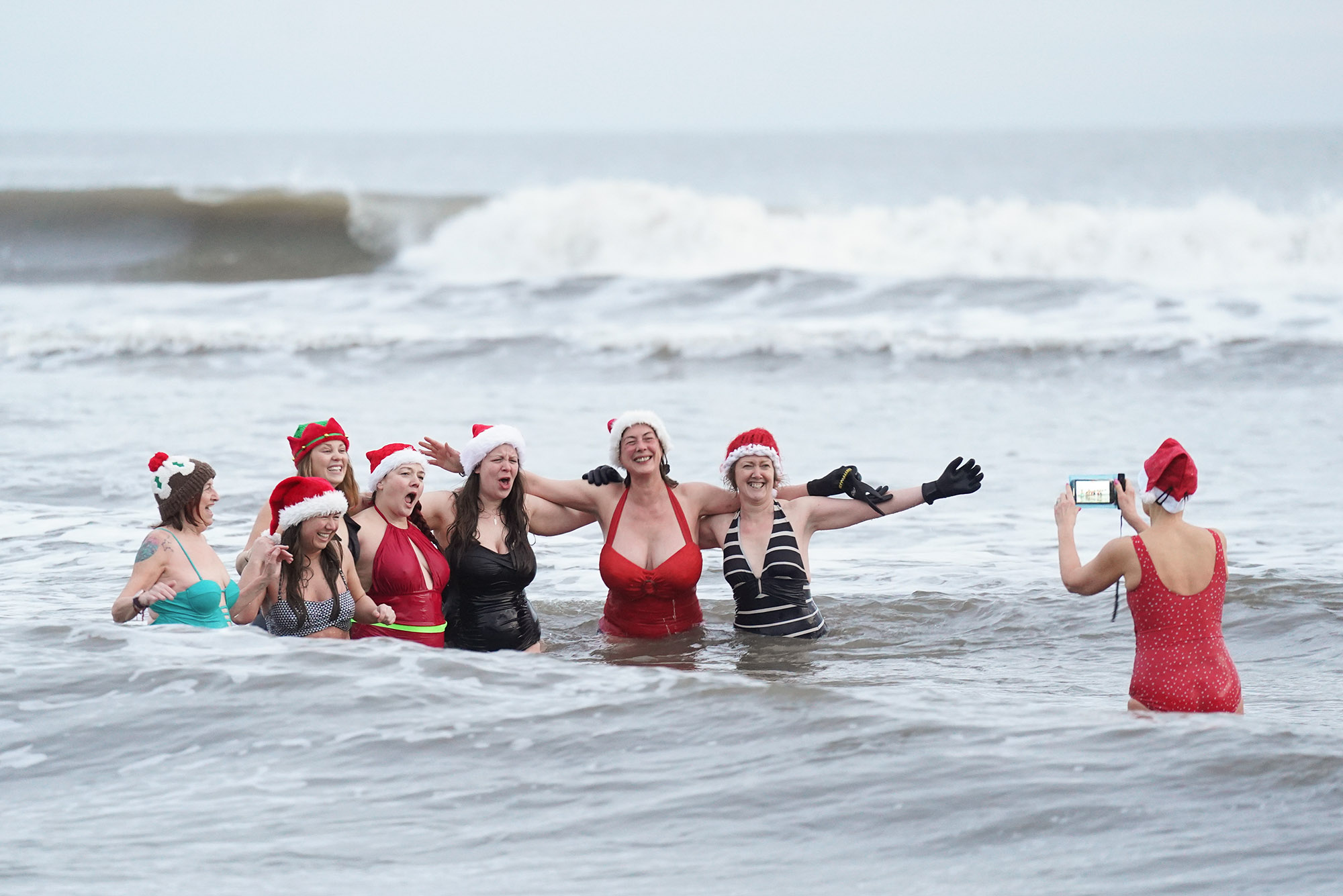 游泳者参加英国泰茅斯隆桑兹的圣诞日游泳。