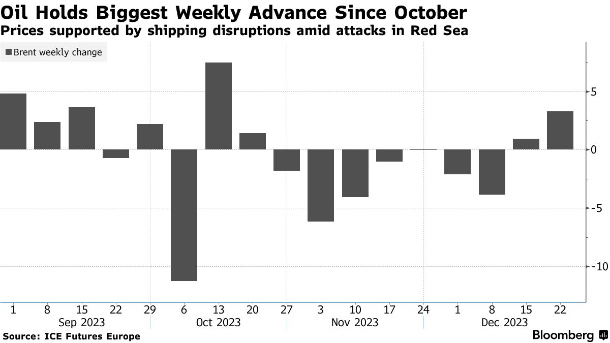 石油在经历了两个多月以来最大的周涨幅后稳定下来,焦点集中在红海的航运中断,此前胡塞武装对这一重要航道的船只发动了一系列袭击。