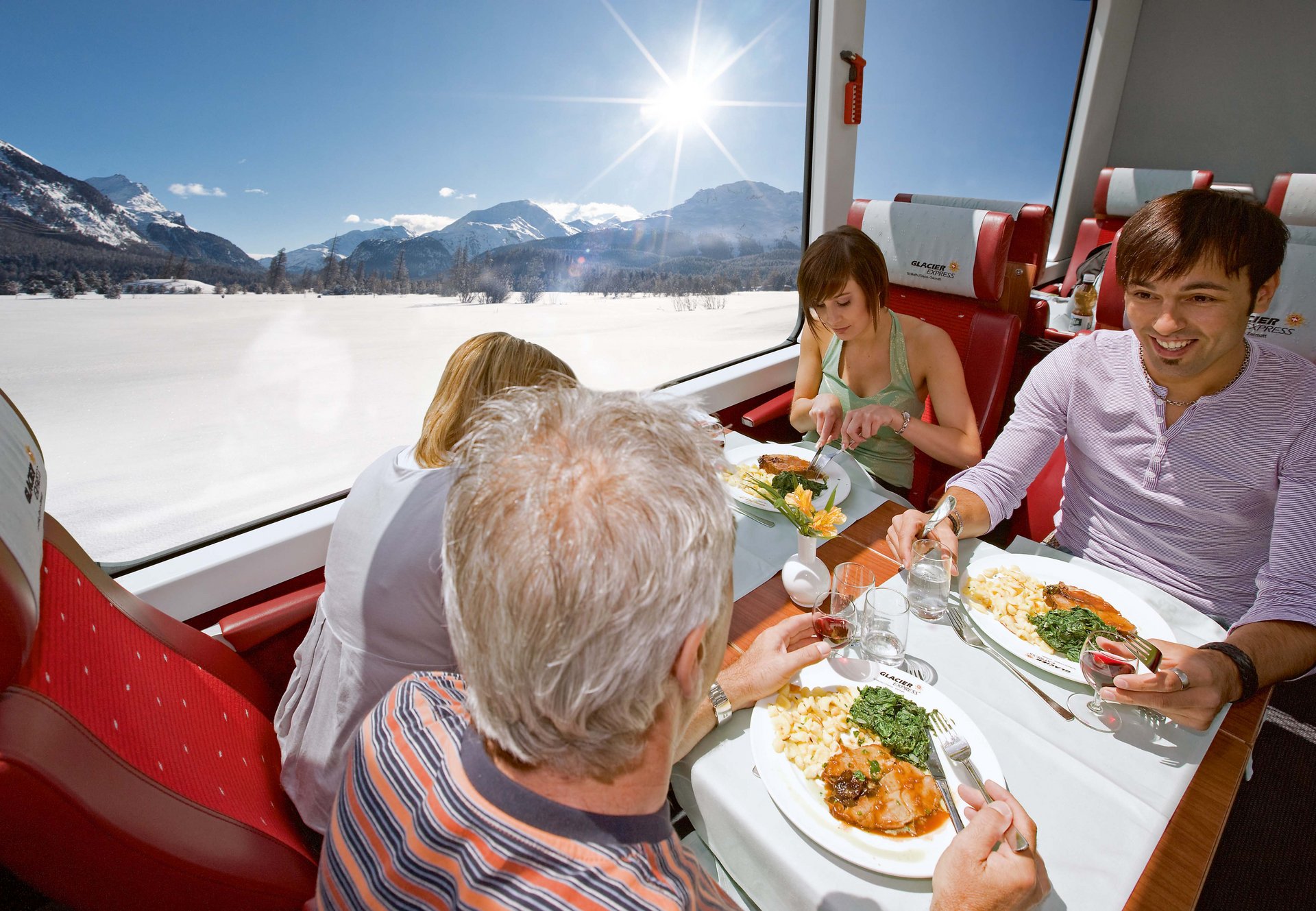 搭乘冰川特快列车,享受白桌布餐饮。来源:冰川特快列车### 在瑞士滑雪和乘火车的冒险