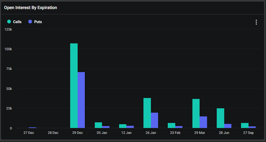 Deribit到期日期权未平仓合约利息。来源:Deribit“我们目前关注的主要事情是12月29日BTC期权的到期日,”加密对冲基金AltTab Capital的联合创始人Greg Moritz表示。“通常情况下,当我们看到有大量期权到期的一天,我们预计当天会出现显著的波动。”