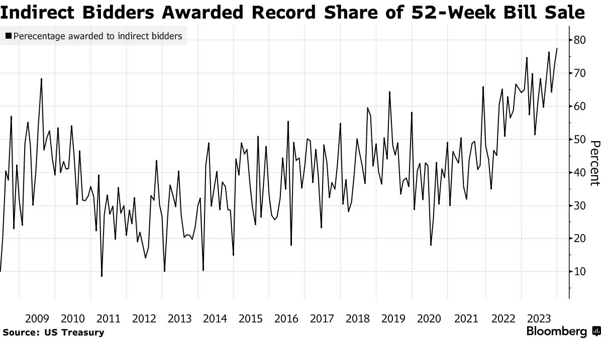 间接竞标者,包括外国央行在内的一群人,抢购了美国国债52周期票据拍卖会的77.6%份额,而同一类别在美国国债6个月期票据拍卖中占据了71.6%的份额,这是有史以来第三大份额。与此同时,一项两年期债券的发行价格低于其预售收益率,显示出超出预期的需求。