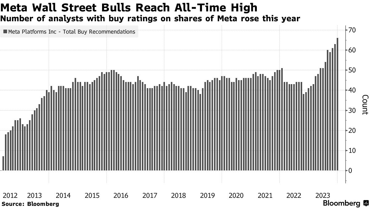 在社交媒体时代,Meta的高飞表现并不令人意外。该公司的股价在2023年几乎翻了三倍,并且拥有华尔街评级中最乐观的偏差。Meta的股价也低于2021年的最高点。