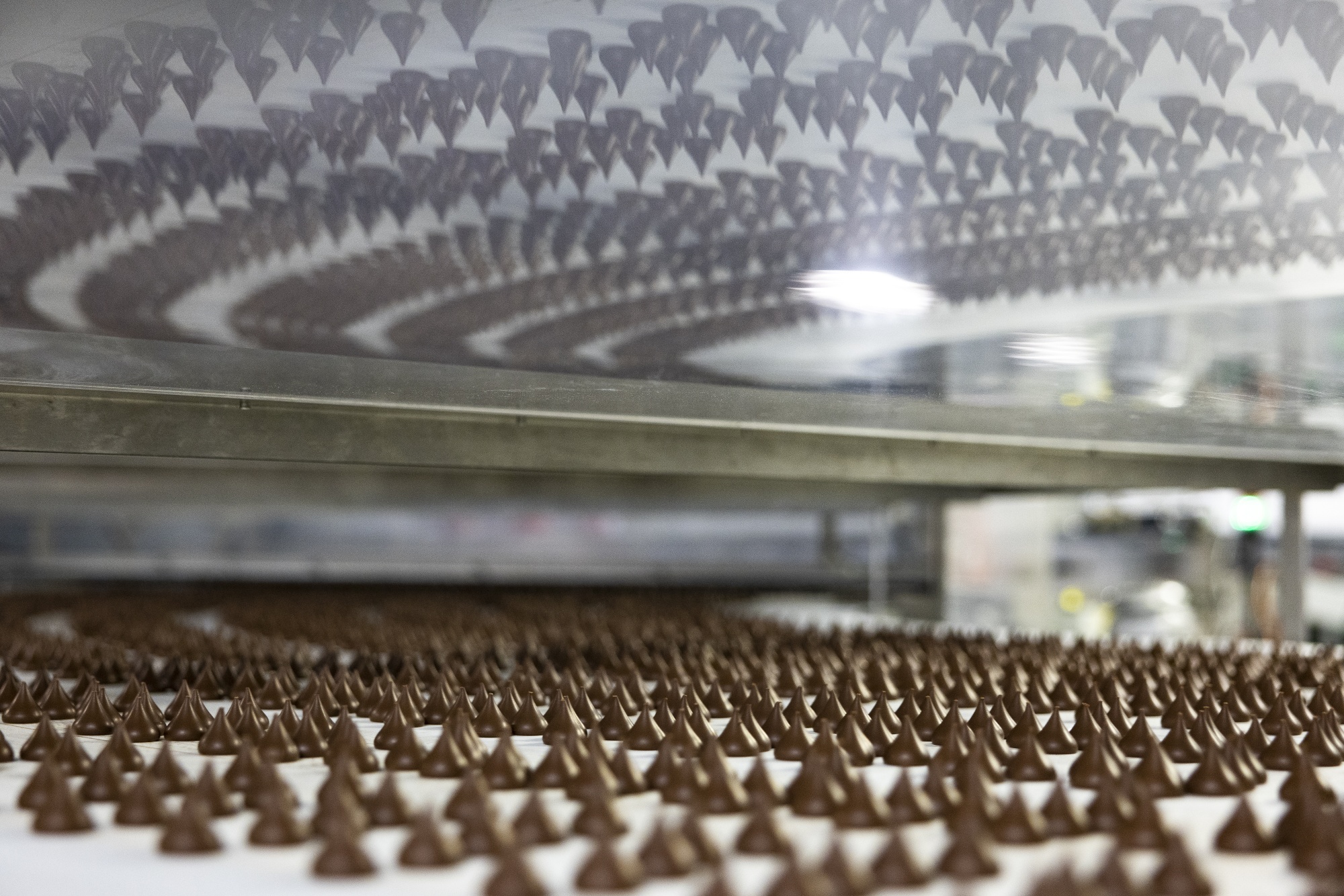 好时巧克力糖果在美国好时公司的工厂上通过传送带移动。