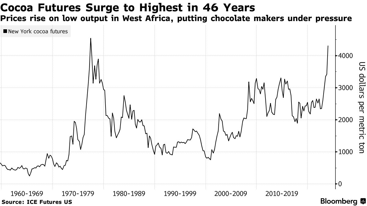 “这是我职业生涯中见过的最不同寻常的情况,” Marex Group农业销售主管Jonathan Parkman说道,他已经跟踪可可市场超过三十年。“我认为我们还没有看到消费者面临的最糟糕的情况。”