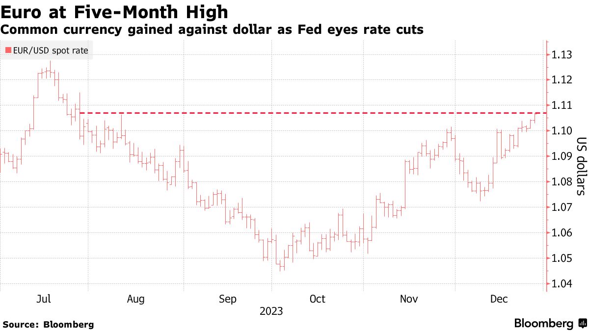 EUR - USD:欧元兑美元汇率五个月来最强,因美联储考虑降息 - 彭博社