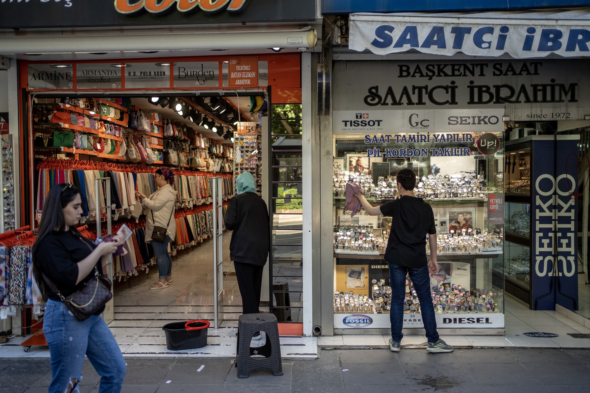 一名工人在土耳其安卡拉的一家手表店橱窗上擦拭,时间是2023年6月26日星期一。土耳其里拉本月对美元贬值了近18%。摄影师:Moe Zoyari/Bloomberg在新的一年里,土耳其将把最低工资提高49%,以减轻生活成本的压力,这是在通胀有望在未来几个月超过70%之前的地方选举之前的举措。