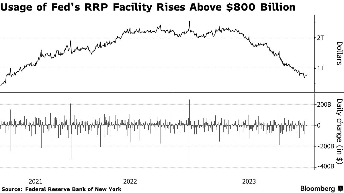 美联储的逆回购交易设施(RRP)是一个供交易对手方(主要是货币市场互助基金)存放多余现金以获得市场利率的地方,目前为5.3%。随着银行减少回购市场活动以整顿资产负债表,这促使货币基金将更多现金转移到逆回购交易设施。周三,有90个交易对手在该设施上存放了8190亿美元,这是自12月13日以来的最高水平。