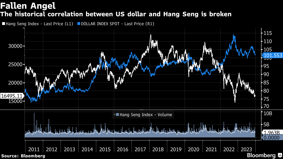 一个令人担忧的趋势正在困扰着恒生指数这个假期。过去,美元走弱会推动香港股市表现强劲,因为该市的金融条件放松,以及以美元计价的投资者来到新兴亚洲寻求更好的回报。但最近,这种历史相关性似乎已经破裂。