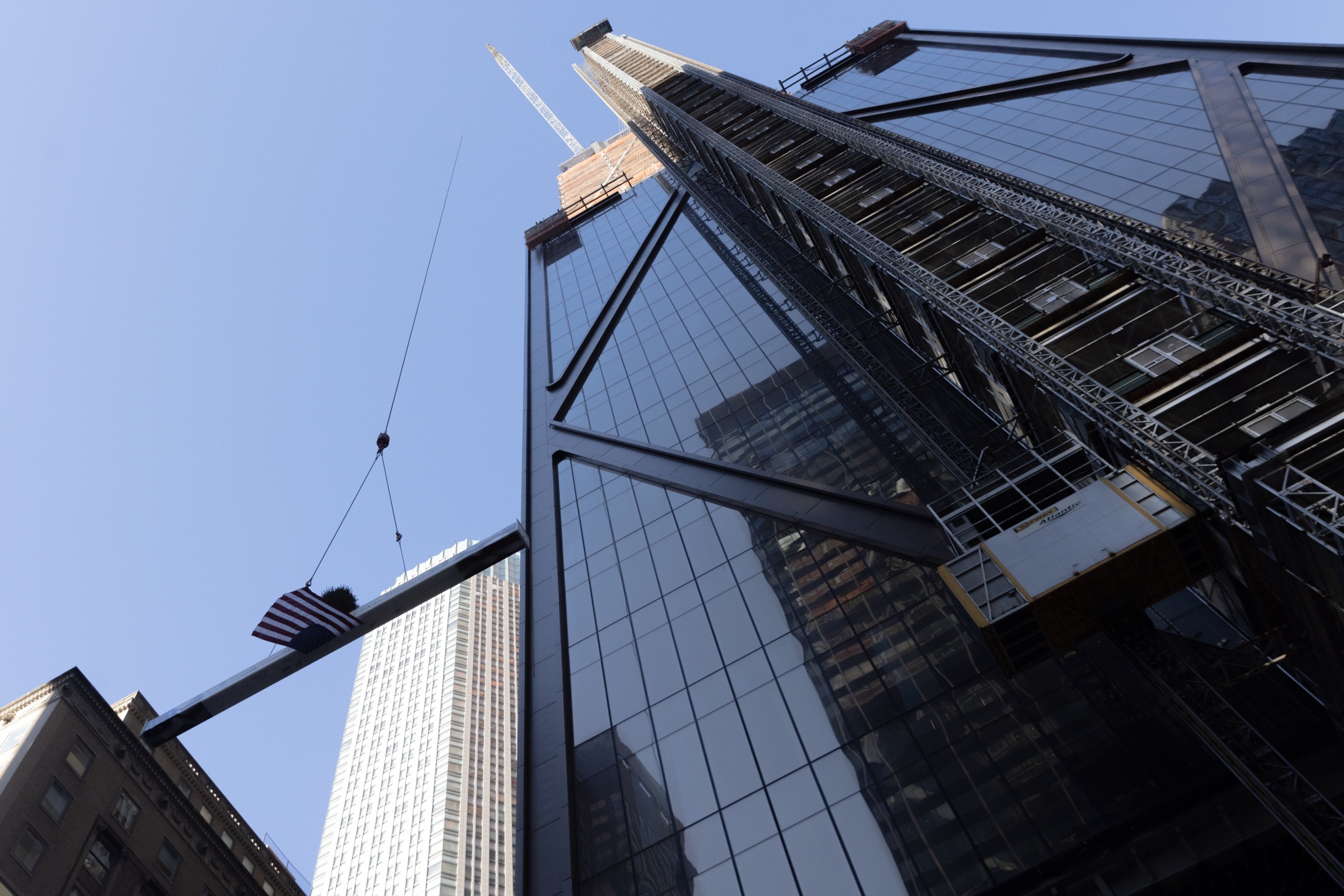 上个月,在曼哈顿的帕克大道270号,摩根大通的新全球总部,一根带有美国国旗的钢梁被升起。这一事件标志着这座新建的1388英尺高的大楼的结构框架完成,将成为约14,000名员工的工作场所。