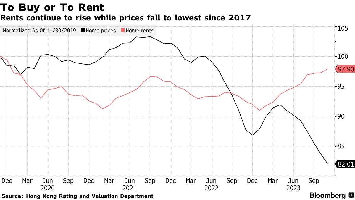 香港房价跌至2017年以来的最低点,而租金上涨-彭博社
