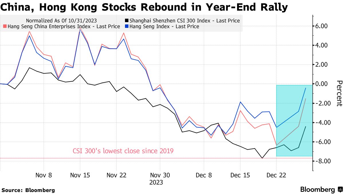 这一反弹发生在沪深指数即将结束三连跌年的情况下,这场抛售导致了估值急剧下降,并促使一些基金经理在2024年增加了对中国股市的持仓。全球股市在过去几个交易日一直上涨,因为人们押注美联储明年将降息。