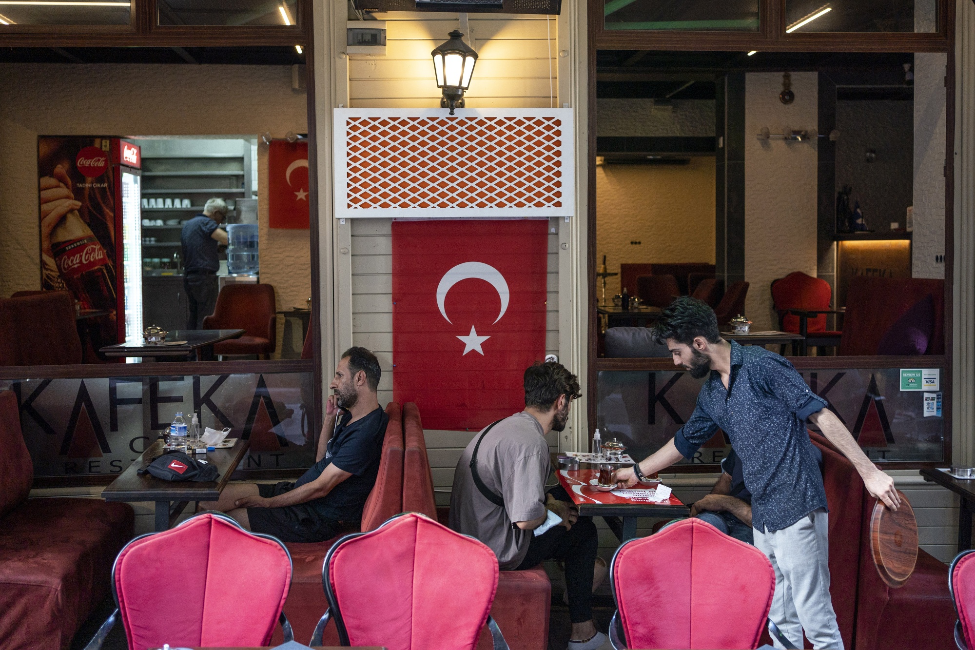 一名侍者在土耳其伊斯坦布尔的一家餐厅为顾客服务。