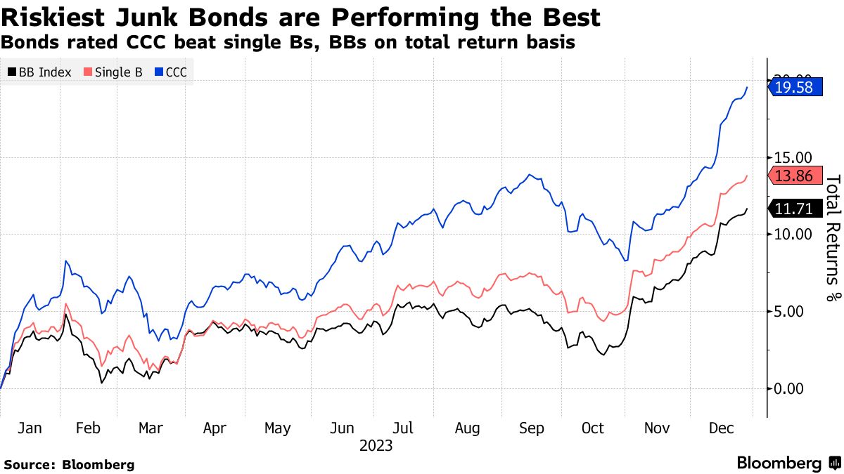 “2024年可能更多地成为剪贴息票的一年,” Distenfeld说道,指的是持有证券直至到期并收取利息支付。“可能会有一点资本增值。你会因违约损失一点,但我不认为会有很大的差异。”
