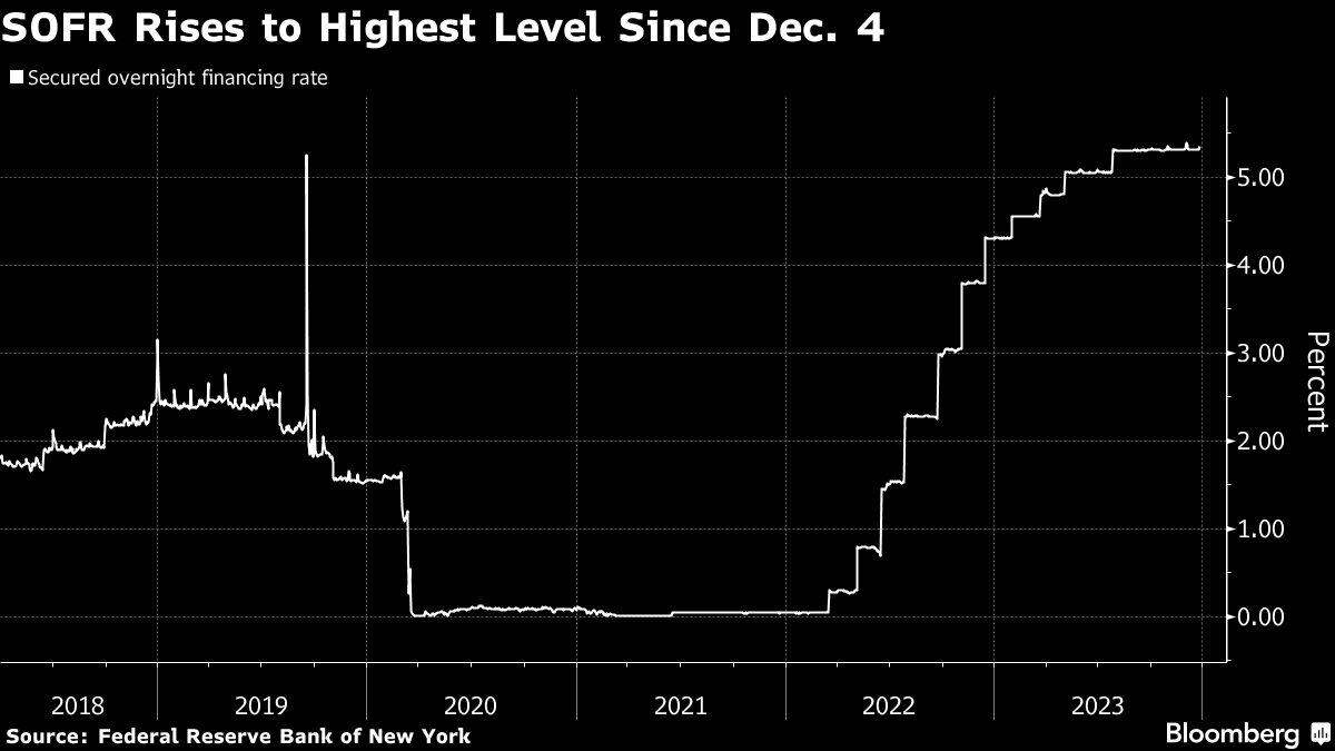 隔夜担保融资利率,或称SOFR(英文缩写),是与隔夜回购协议交易相关的基准利率。当融资成本上升时,SOFR也往往会上升。根据纽约联邦储备银行周三公布的数据,截至12月26日,SOFR为5.35%,高于前一交易日的5.32%。这远低于12月1日达到的5.39%的历史最高水平。