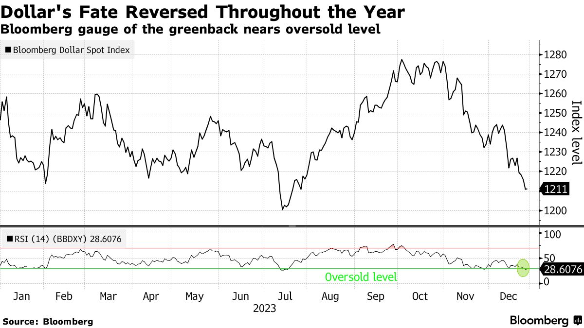 在被一系列错误的开始预示美联储加息周期结束的情况搞得晕头转向后,彭博对美元的衡量指标自1月以来下跌了近3%,这是自2020年以来美元年度跌幅最大的一次。虚假的开始很大程度上导致了这种下跌,因为市场越来越看好美联储明年将大幅放松政策,而美国经济也在放缓。这削弱了美元的吸引力,因为其他央行可能会将利率维持更长时间。