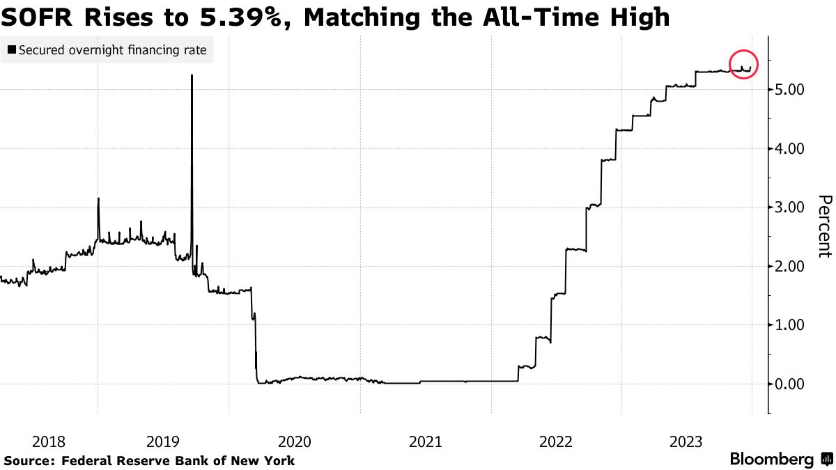 资金成本上升往往也会推高SOFR。根据周四纽约联储公布的数据,SOFR从前一个交易日的5.35%上升至12月27日的5.39%。这与12月1日达到的历史最高水平相匹配。