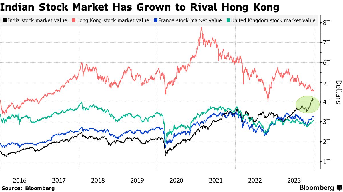 这一前所未有的连胜使印度股市估值首次突破4万亿美元,接近香港。随着印度继续成为亚洲最受青睐的市场之一,这一差距可能进一步缩小,原因是印度是世界主要经济体中增长最快的国家之一,而投资者对其最大新兴市场竞争对手中国的前景仍然持续担忧。