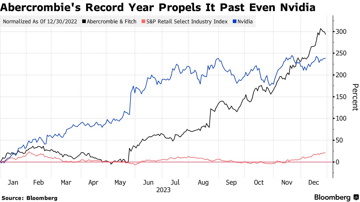 (ANF) 阿贝克龙比2023年股价暴涨300%,甚至超过了炙手可热的英伟达(NVDA)- 彭博社