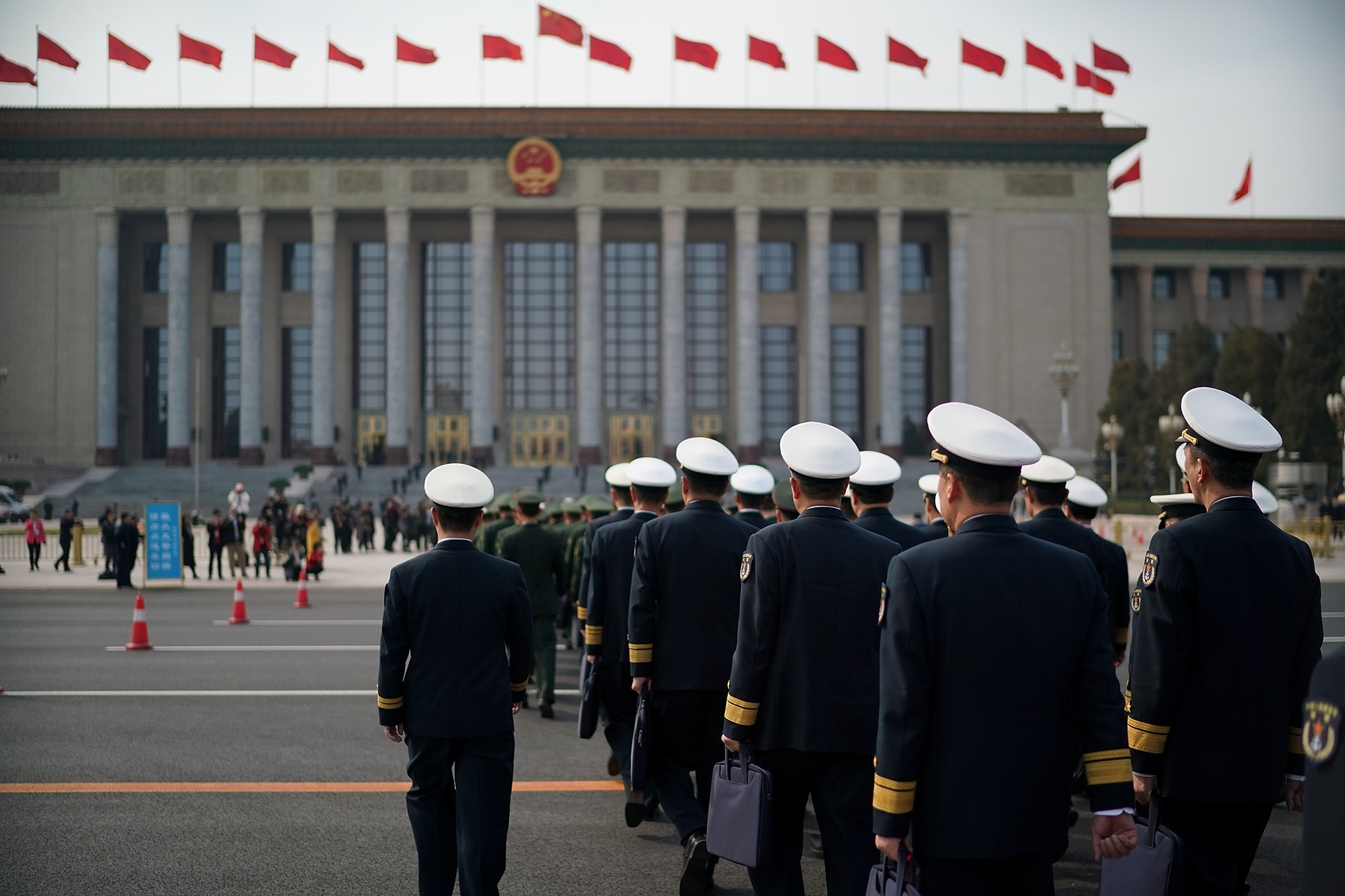 军事代表在北京天安门广场行走。