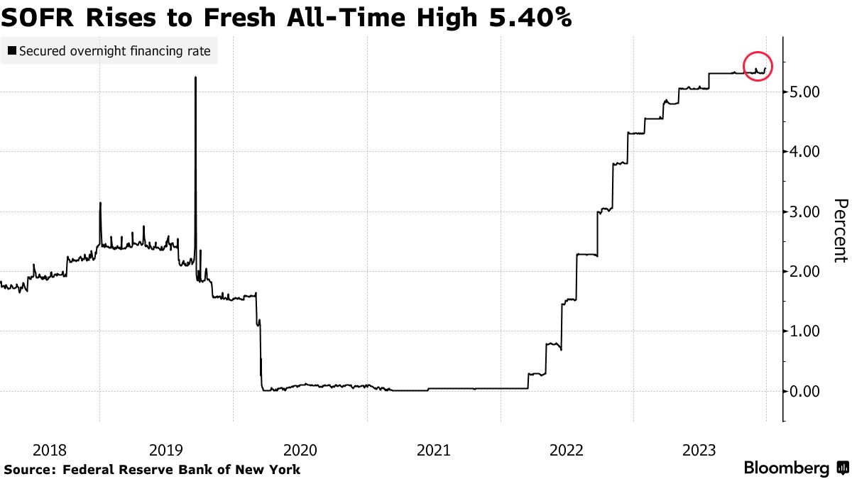 根据上周五发布的纽约联邦储备银行数据显示,由于年底前市场资金紧缺,担保隔夜融资利率于12月28日升至创纪录的5.40%,高于前一日的5.39%。这是自2018年4月该基准首次亮相以来的最高定价。